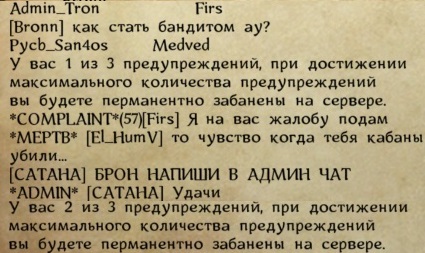 Забанили за то что Бандит рдмил комов в городе,я много писал админам(были Трон и Сатана, но они сказали не наши проблемы мол у нас ивент) я решил разобратся с ним сам,убив его в деревне мне дали 3 предупреждение и я был забанен